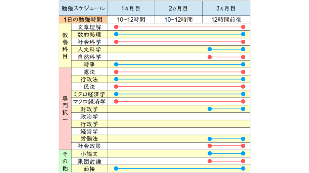 行政法、民法、財政学、この辺りの科目も比較的重要度が高いのですが、勉強難易度が高めなので、3ヵ月で合格したいとなったらある程度サラッとやるしかないと思います。