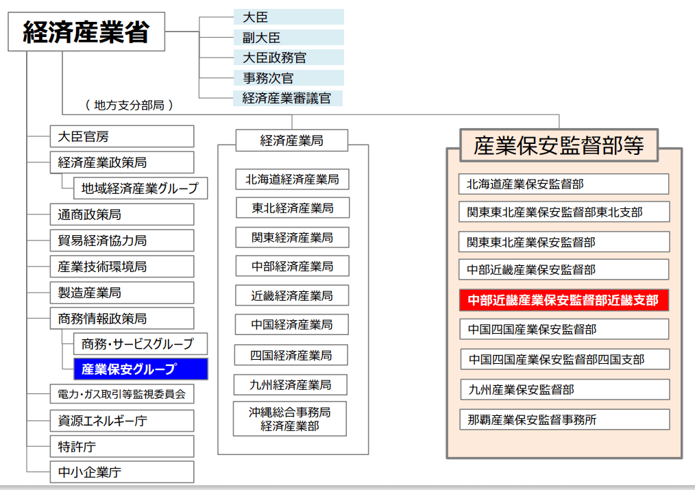 まず、経済産業省の内の組織図は上記の通りです。その中に産業保安監督部は位置付けられています。