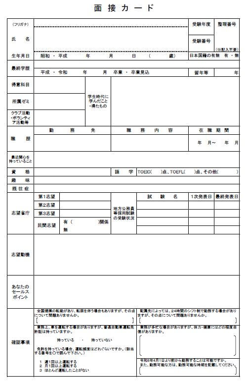 公務員のライトが提供している「官庁訪問クラス」では、最新の試験体験談や、合格者の面接カード記載例が見放題となっております。