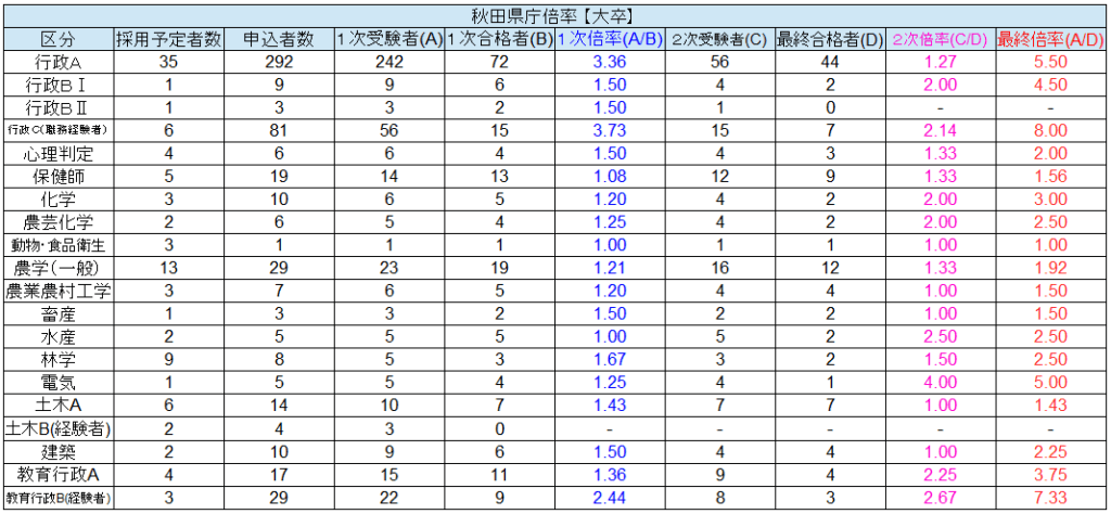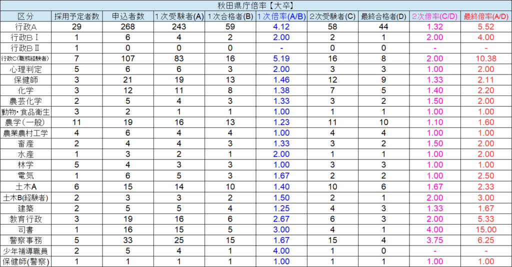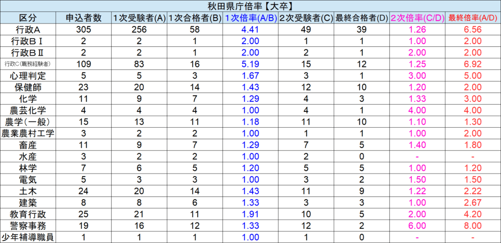 秋田県の公務員試験がどれくらい難しいのか?が見えてきますが、比較的難易度は高めだと考えておきましょう!