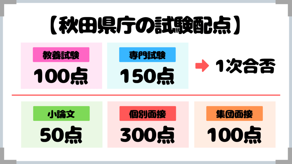 - 秋田県庁は筆記重視!筆記の倍率が高く、ボーダー点もかなり高くなってきそう。