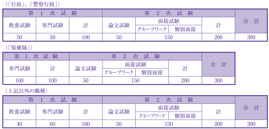 また、1次試験は技術職や専門職の方は行政職の方と配点が違うので要注意。