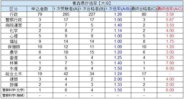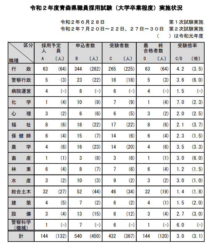 青森県は1次倍率、2次倍率等、こまかい情報が公表されていません。