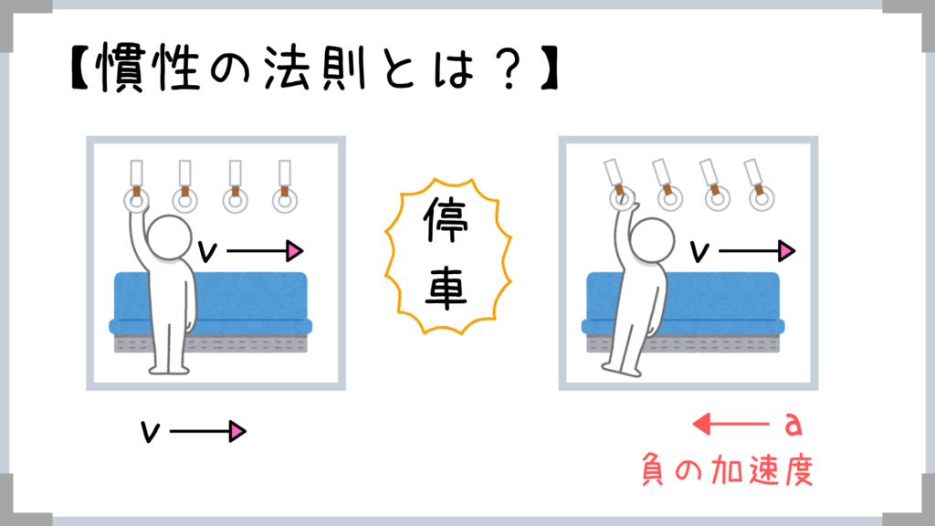 電車と人は同じ速さで運動している。人は等速直線運動(前に運動)を続けようとしているのに、電車は止まるからバランスを崩した!