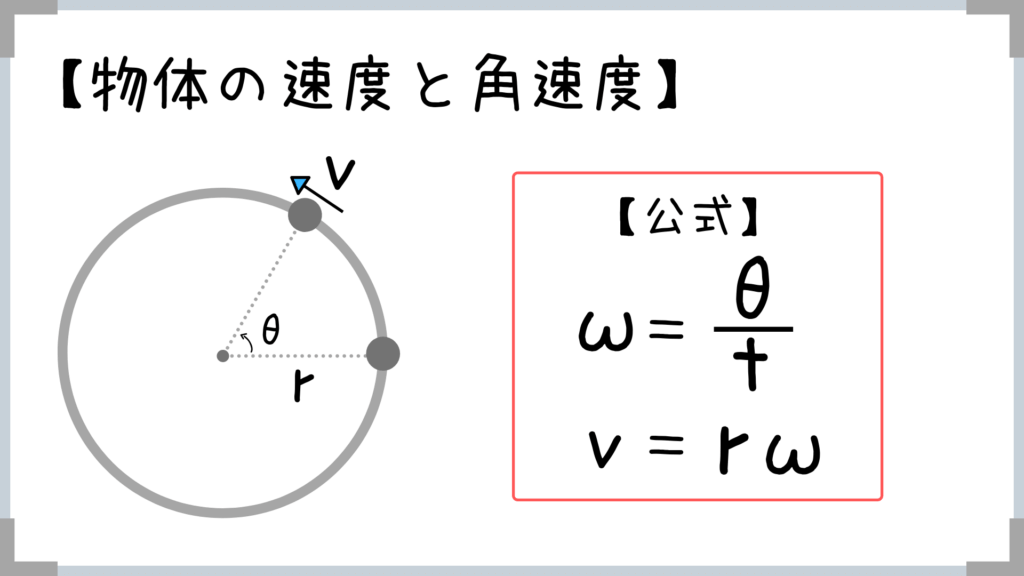 t秒間で物体が角度θ[rad]だけ回転した時の角速度ωは「ω=θ/t」であらわせます。