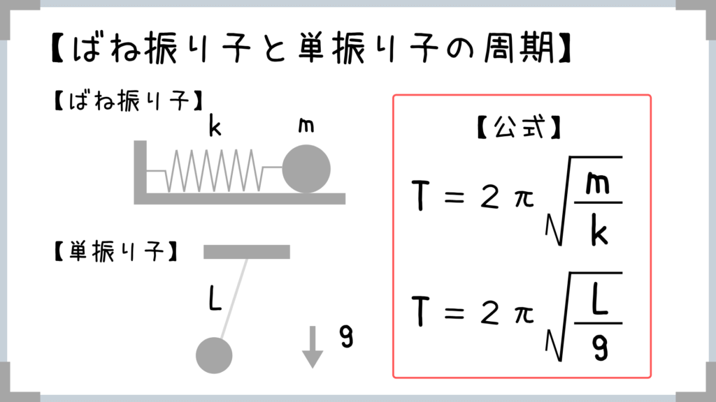 実際はこの形だけ覚えておいて、mを大きくしたり、エレベーター等に乗せてgを大きくさせたり小さくさせたりして、周期Tの大きさの大小について考えさせる問題がよく出ています。