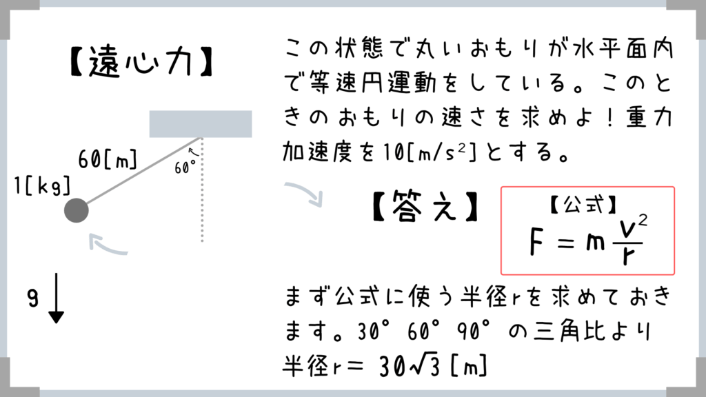 ここらへんで真面目に1問だけ遠心力の基礎問題を解いておきましょうか!基本的に力を図示して、タテヨコのつり合いの式を立てて、求めたい値を求めていくっていう流れで解けばたいてい遠心力の問題は解けます!