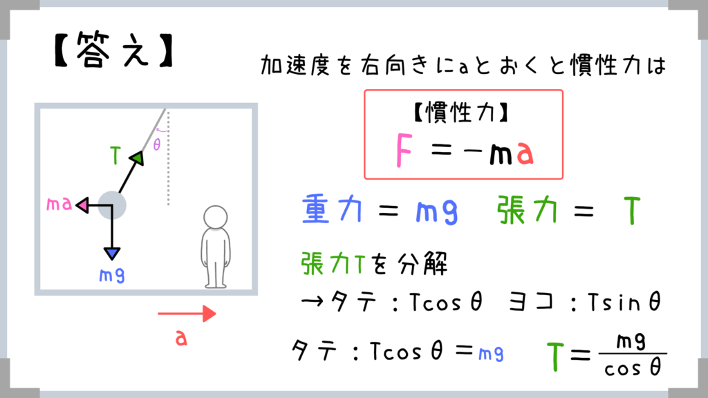 慣性力とか関係なしに、力の分解をするだけで答えが出ちゃいます。