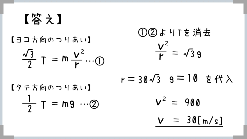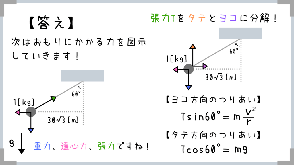 力が図示できて、遠心力の公式を忘れずに書くことができたら、あとはタテヨコのつりあいの式を立てるだけ!