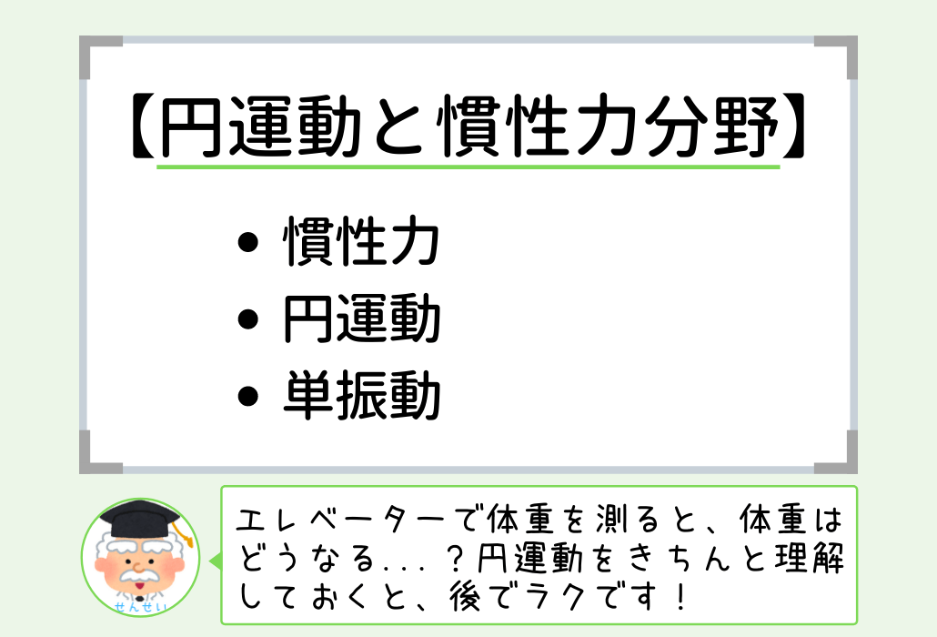 はっきり言って重要度低いです! →物理の楽しさを紹介? 重要度は低いのですが、範囲が狭いですし、出題されるポイントも決まっているので 本番で出題されたときに得点しやすい分野となってます! まぁ円運動は理解難易度が高めかな...