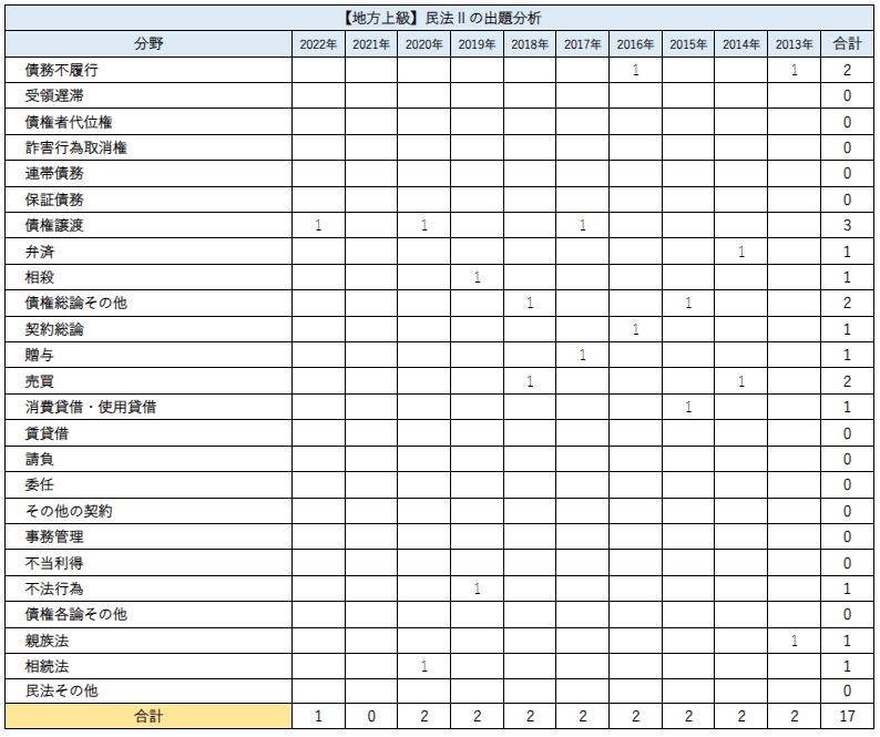 国家一般職や東京特別区では、『総則・物権・担保物権』→民法Ⅰ、『債権総論・債権各論・家族法』→民法Ⅱと分けています。