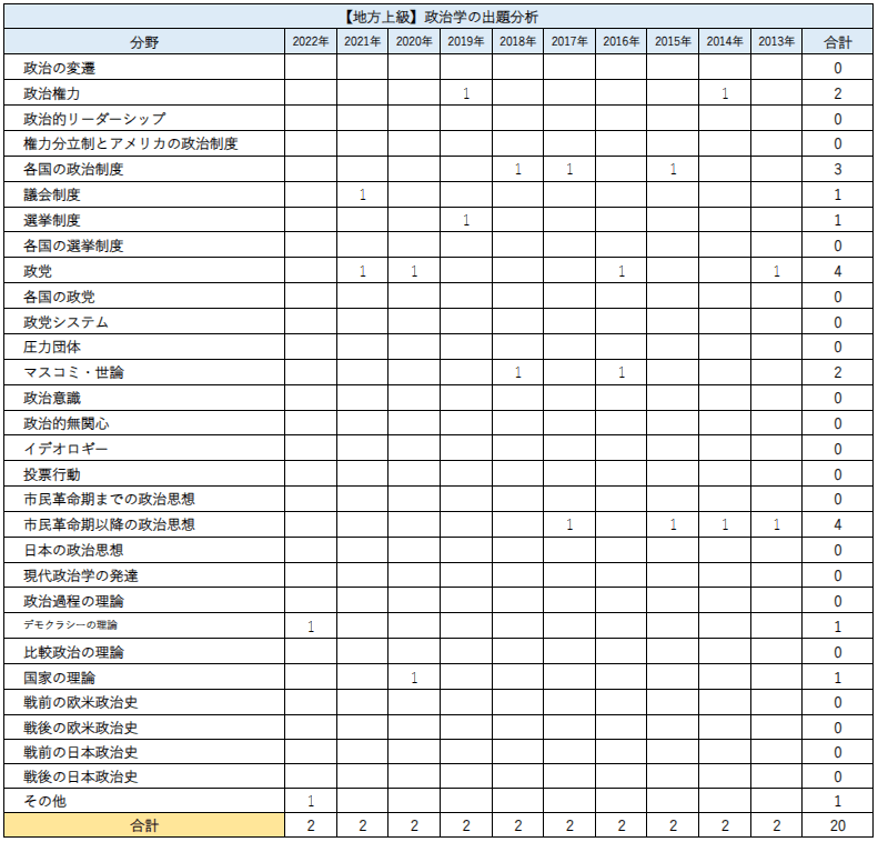 政治学の出題数は全国型が2問、関東型が2問、中部・北陸型が2問です。