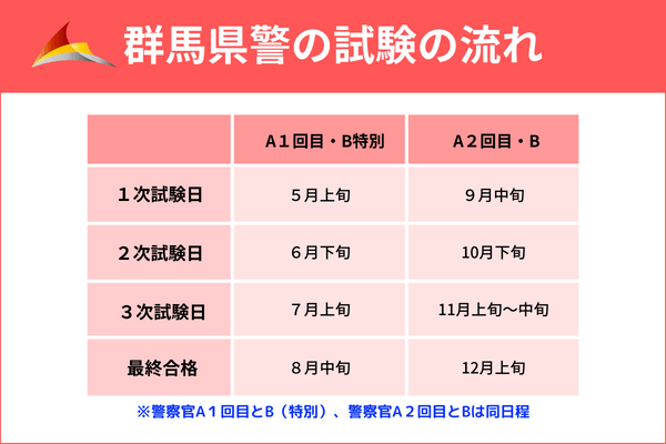 群馬県警の試験区分警察官A1回目、警察官A2回目、警察官B、警察官B(特別)に分かれています。