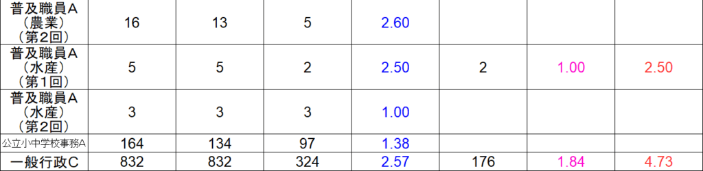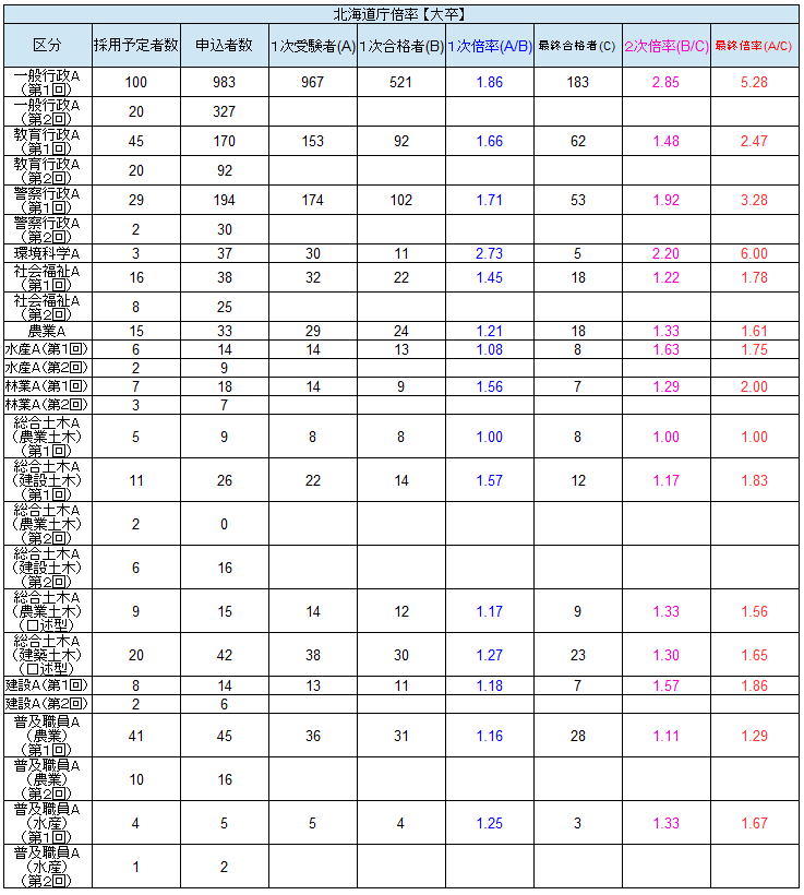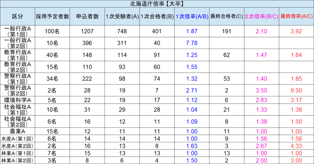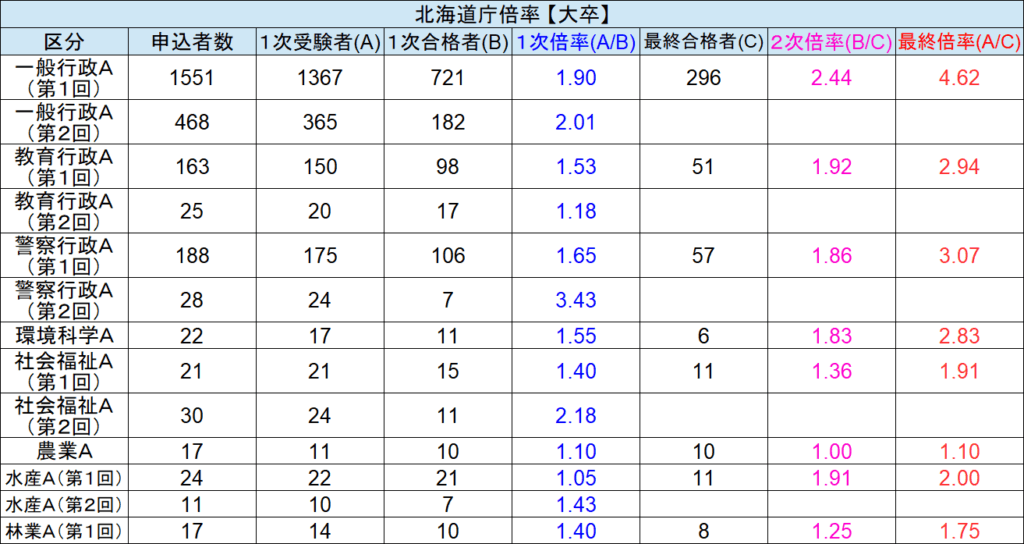 北海道庁の行政A(第一回)の最終合格倍率は4~5倍前後です。