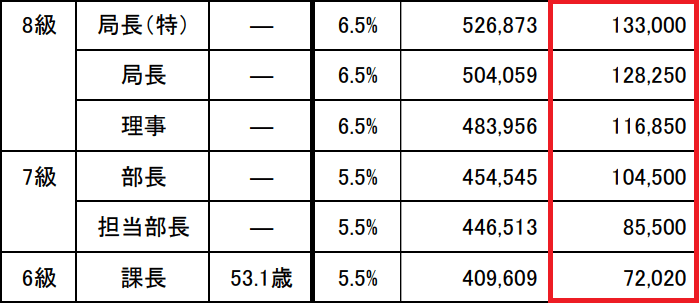 課長で平均6.5万円~部長で10.5万円くらいが平均だと思われます。