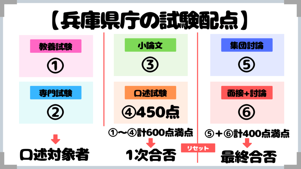 →2次試験からが本番!2次に進んだ人はレベルの高い人の集まりなので、ココで負けないように早め早めの対策を心がけて下さい。(兵庫県庁はリセット方式)
