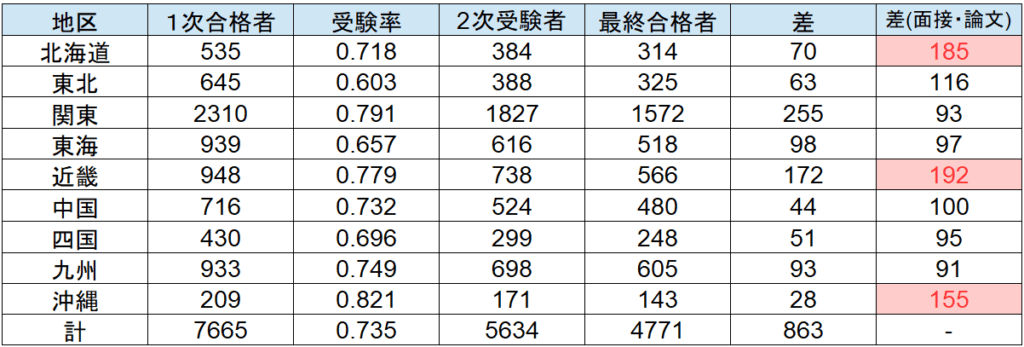 ⇒ココがカギで、北海道、近畿、沖縄の3地区で単純に点数不足で落ちてしまった人は100~200名ほどだと推測できます。(例:筆記がボーダー付近+3Cで不合格、ボーダー付近+4Dで不合格等)