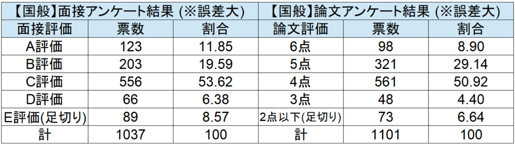 そこで受験生たちにTwitterやLINEで協力してもらって、自分の面接・論文の評価について1000名以上の方にアンケートに答えていただきました。