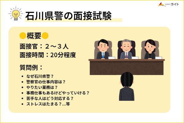 石川県警の面接試験は、面接官が2~3人、面接時間が20分程度となっており、面接官からの質問に答えていく試験です。