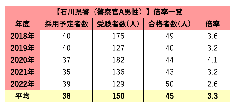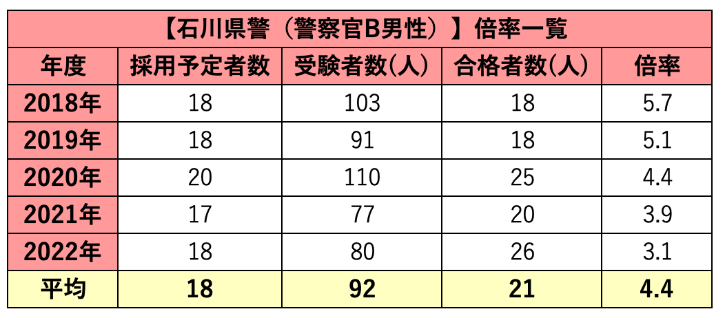 石川県警の試験難易度について、『試験倍率』を元に解説していきます。