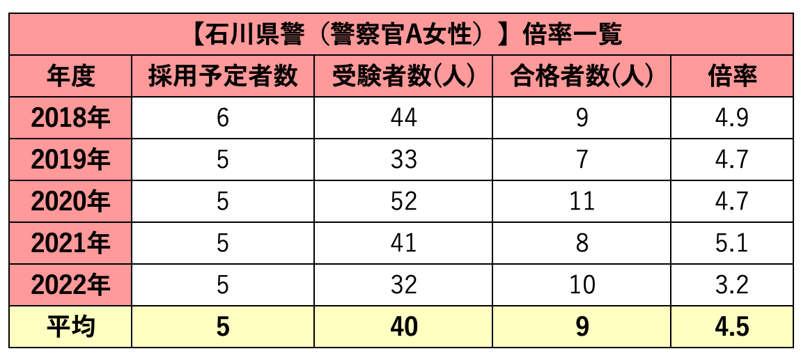 石川県警の採用試験倍率:警察官A(女性)