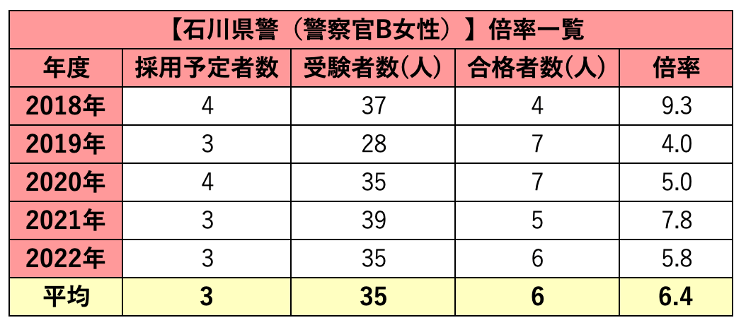 石川県警の採用試験倍率:警察官B(女性)