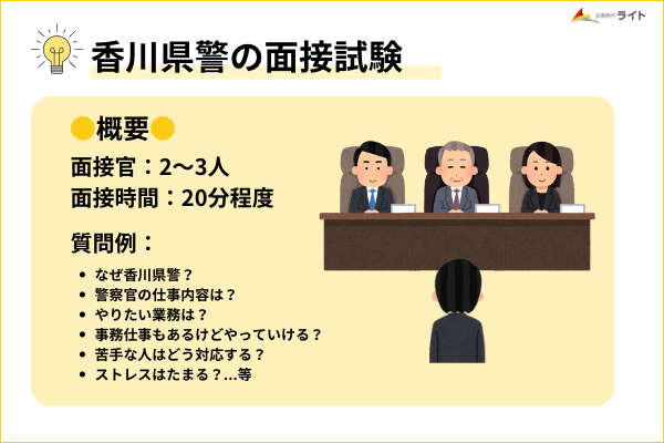 香川県警の面接試験は、面接官が2~3人、面接時間が20分程度となっており、面接官からの質問に答えていく試験です。