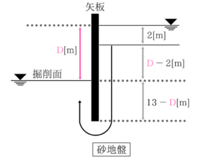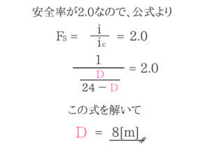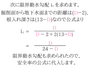 ⇒そして動水勾配の公式の分子も’’掘削面から地下水面までの距離’’なので注意が必要です。クイックサンドの公式