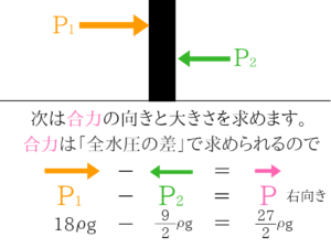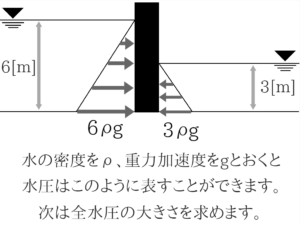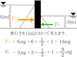 - 奥行きを1mとすると全水圧の大きさは三角形の面積ということ