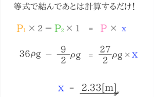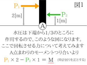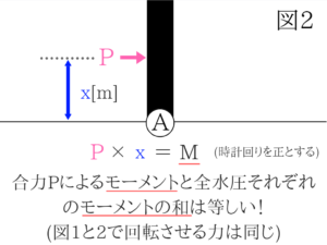 - 「合力Pによるモーメント」と「全水圧それぞれのモーメントの和」は等しいということ