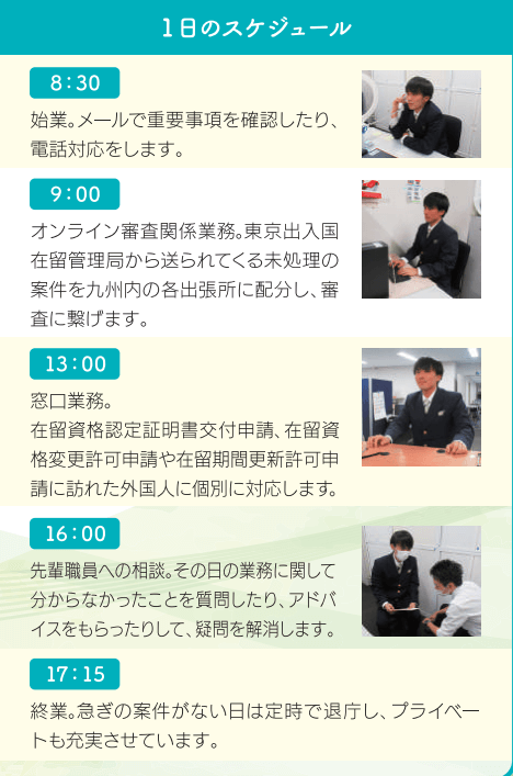 出入国在留管理局の若手職員の1日の過ごし方の例です。