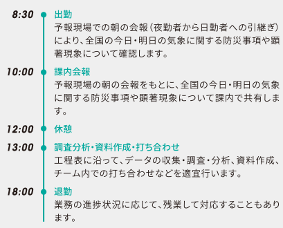 上記は、管区気象台の職員の1日の仕事スケジュールの例です。