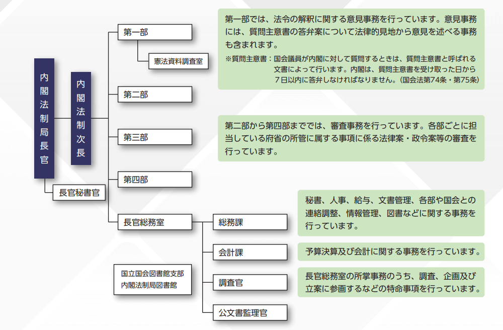 内閣法制局は、内閣や各府省庁に対して、法制面から支援を行う機関です。