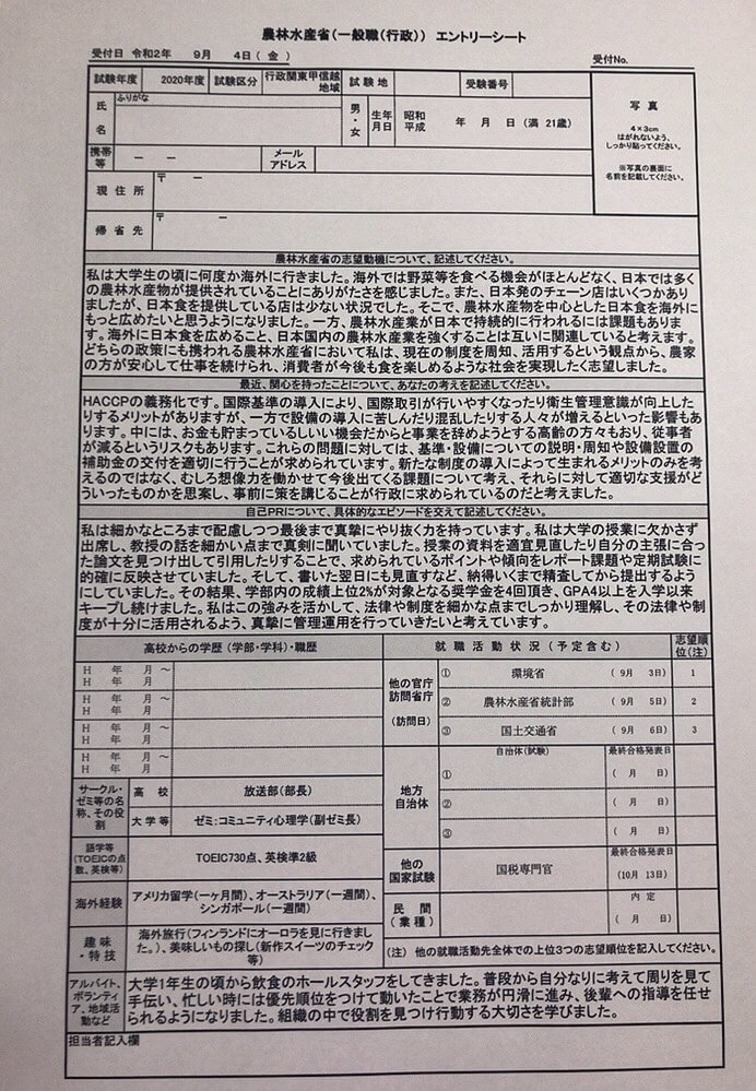 • 去年の体験記に、「農林水産省は1日目の訪問者からほとんどの人を取るから、2日目以降に行く人からは一部だけ取るらしい」ということが書かれてあり、不安なところはあったのですが、私のように2日目にオンラインスタートでも大丈夫だった例があることを知っていただけると嬉しいです!(今年が特殊なだけかもしれませんが…)