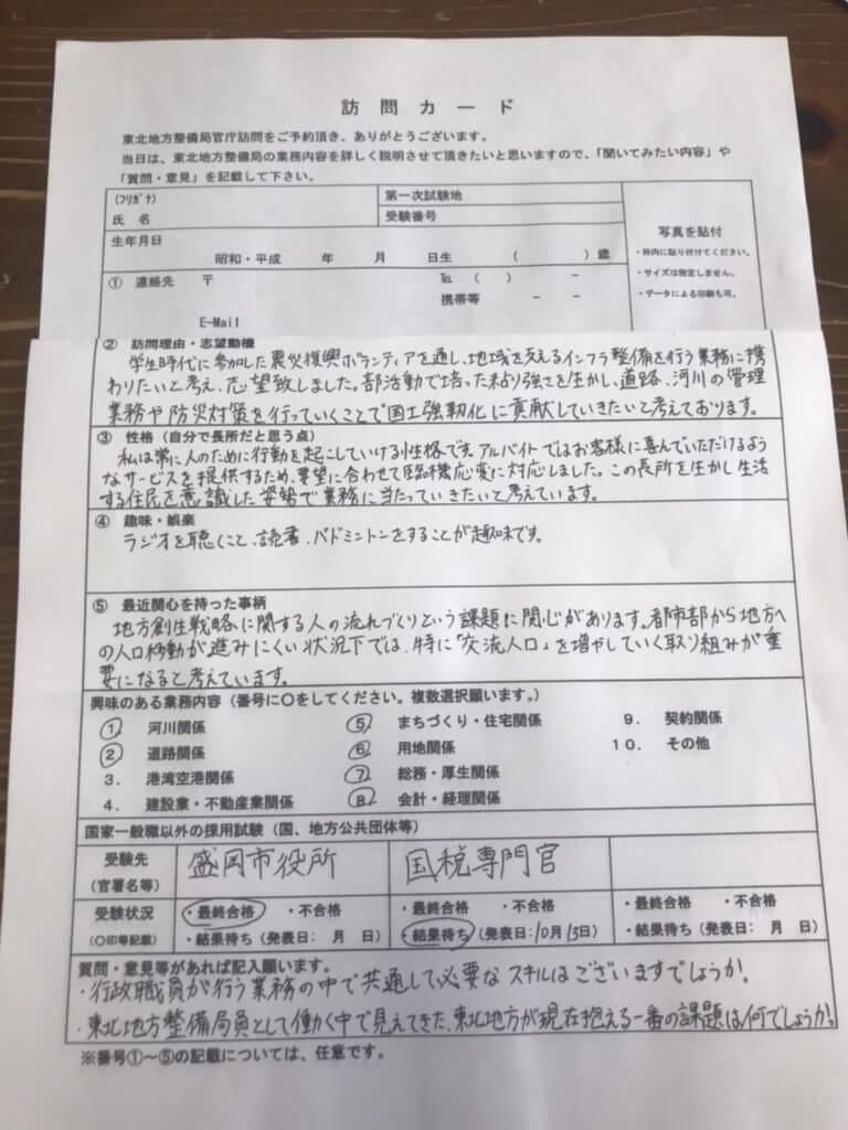 • また、自分の感覚ですが、省庁によっては内々定を出すかどうかは面接カードを見てあらかた決めているところもあるのではないかと思ったので面接カードをきちんと書きましょう。(特に志望理由。そこだけでも添削してもらえる機会があるのならしてもらったほうがいいと思います。)