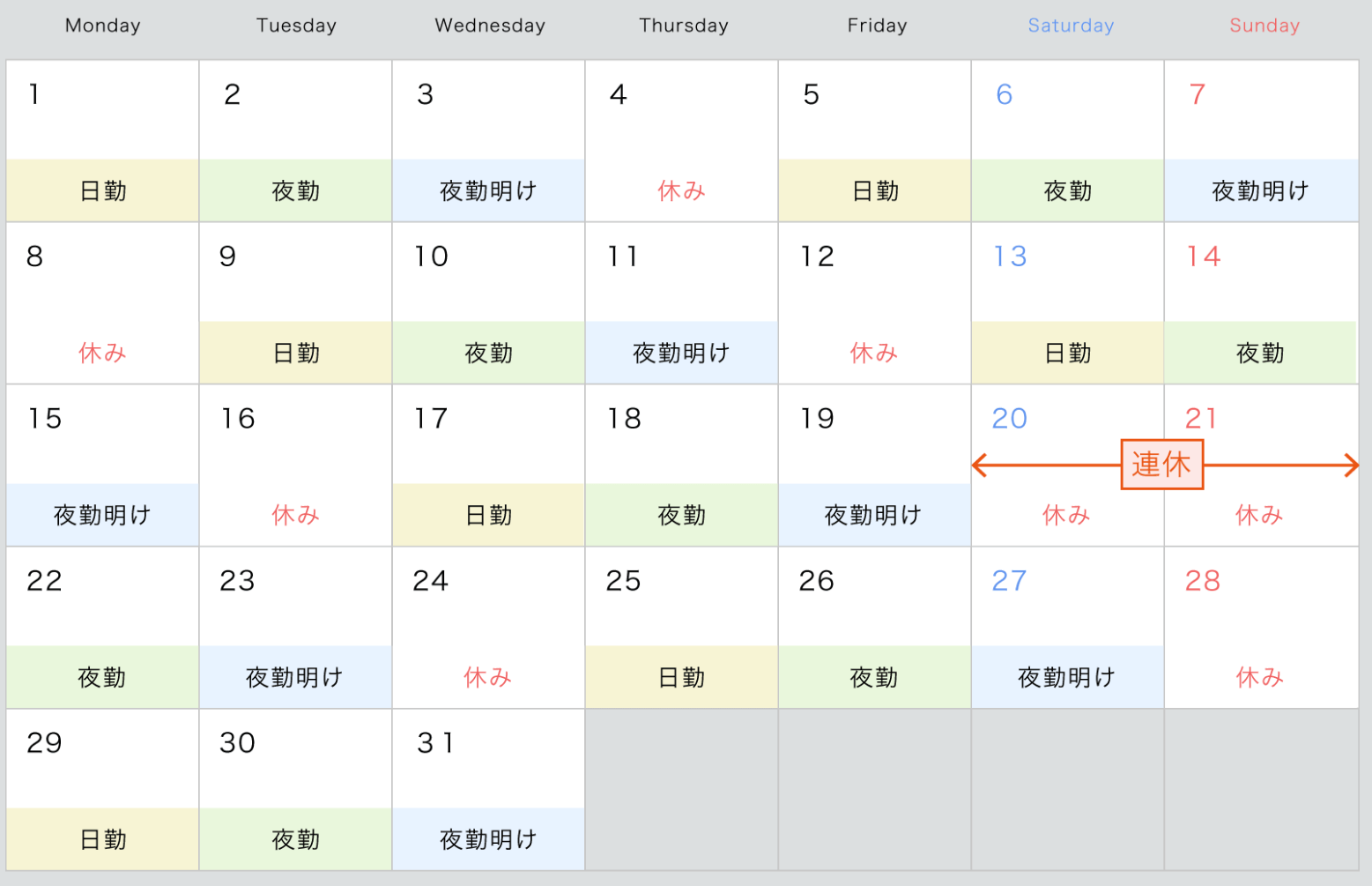 日勤はカレンダー通りに出勤し、出勤時間は8:30~17:15まで。