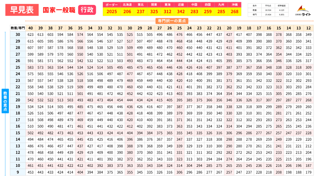 国家一般職の筆記ボーダー点の詳細版です。左の列(9~30)が教養試験の素点、上の行(12~40)が専門試験の素点です。この列と行がクロスしたところが、持ち点(標準点)になります。