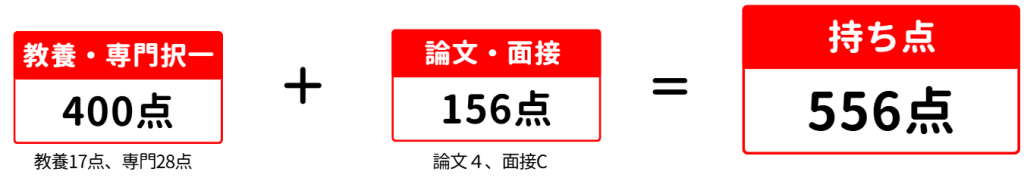 STEP1の教養・専門択一の標準点と、STEP2の論文・面接の標準点を合計したものが、自分の【持ち点】です。こちらと、【最終合格ボーダー点】を比較して、超えているようであれば、最終合格をすることができます。