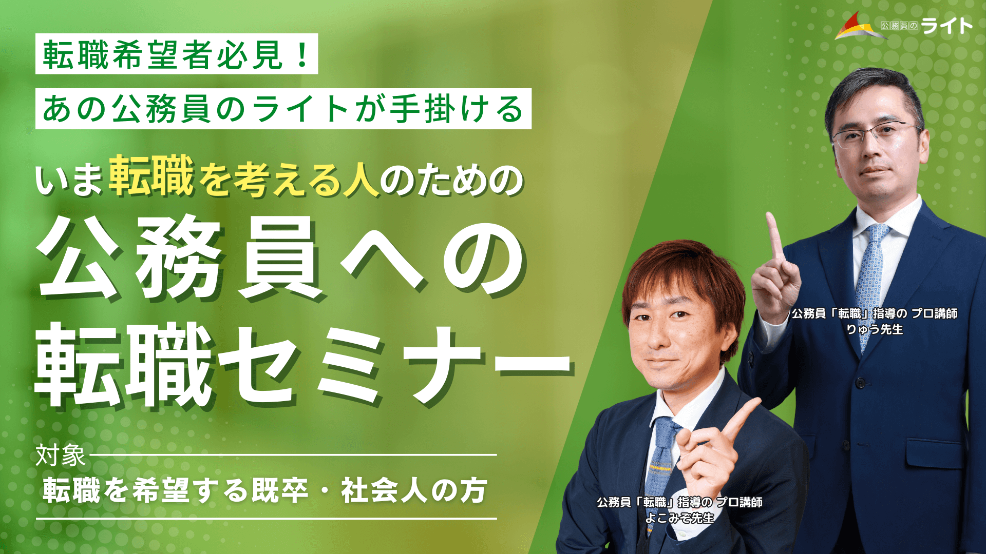 「民間から公務員転職って実際のところ難しい?」「公務員への転職活動って何から手をつけたらいいの」そんな不安や疑問を抱えている方に。このセミナーでは公務員「転職」指導のプロ講師が、公務員転職の始め方を解説します。