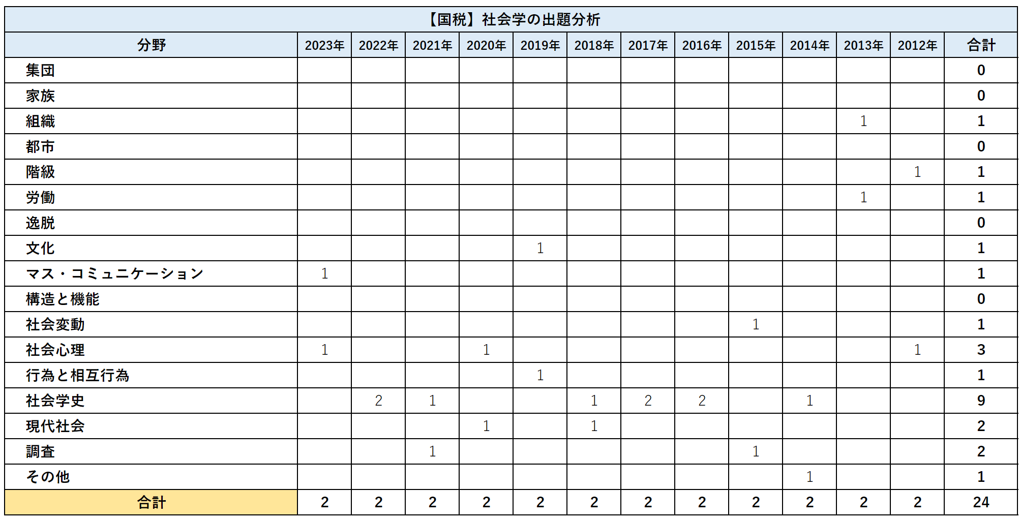 【国税専門官】社会学の出題数