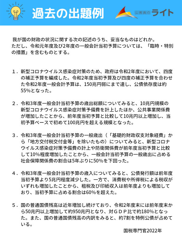 その理由として、ほとんどの試験種では前年度のデータから出題されますが、国税専門官の財政学では前々年のデータが出たりするので注意が必要です。