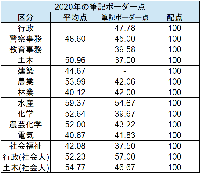 例えば、行政系は平均点が48.6点/100点なのに対し、合格点はそれ以下です。