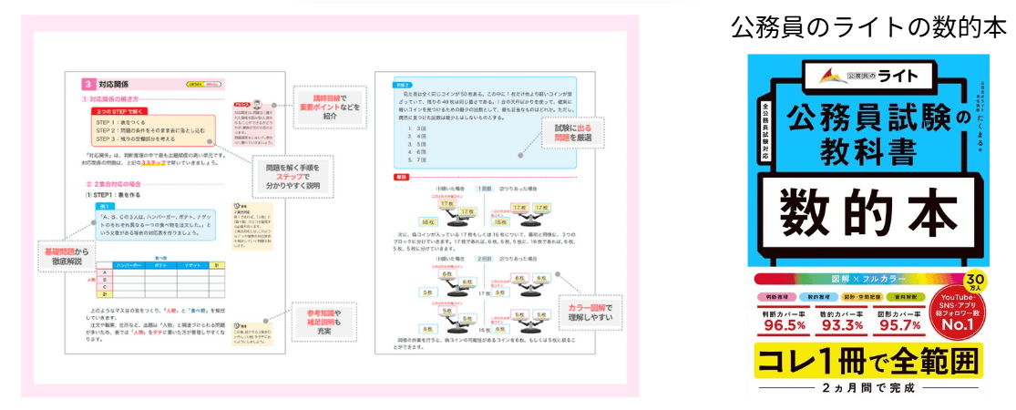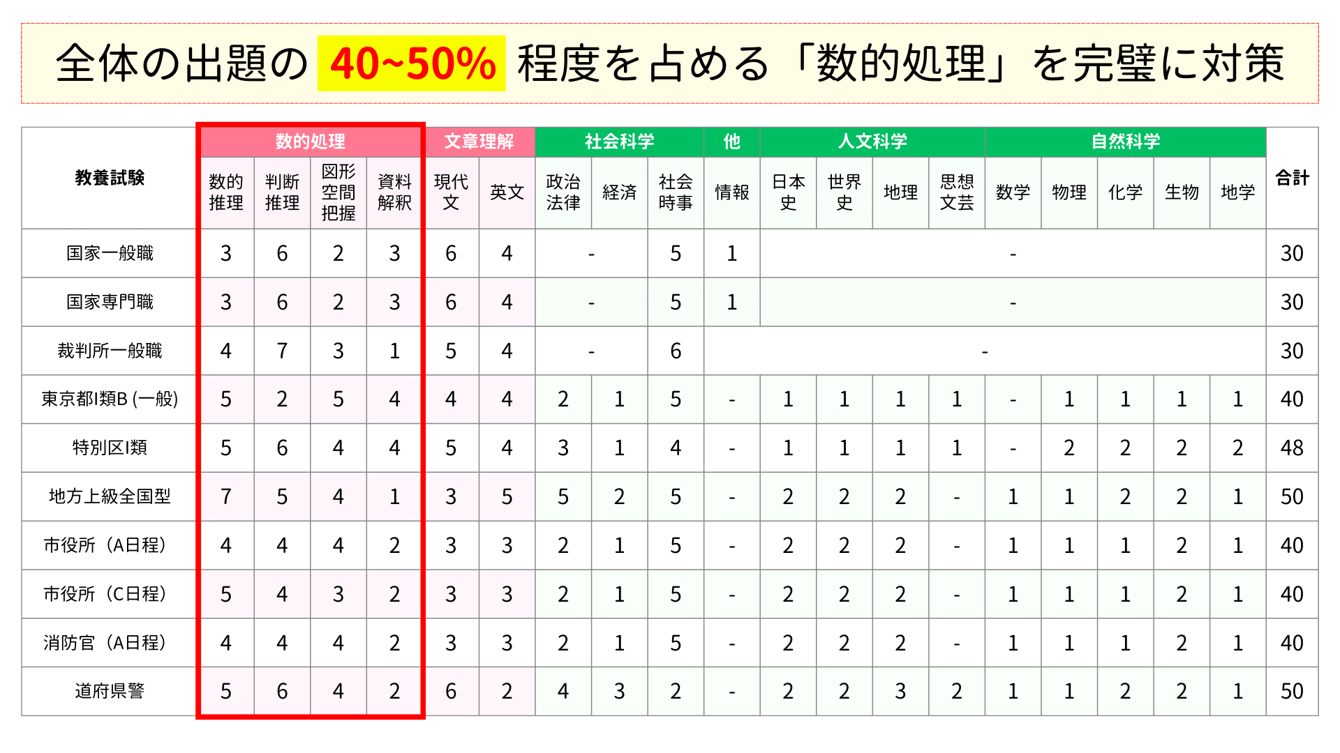 数的処理は、教養試験の出題の40~50%を占める科目なので、ここをしっかり対策することができます。