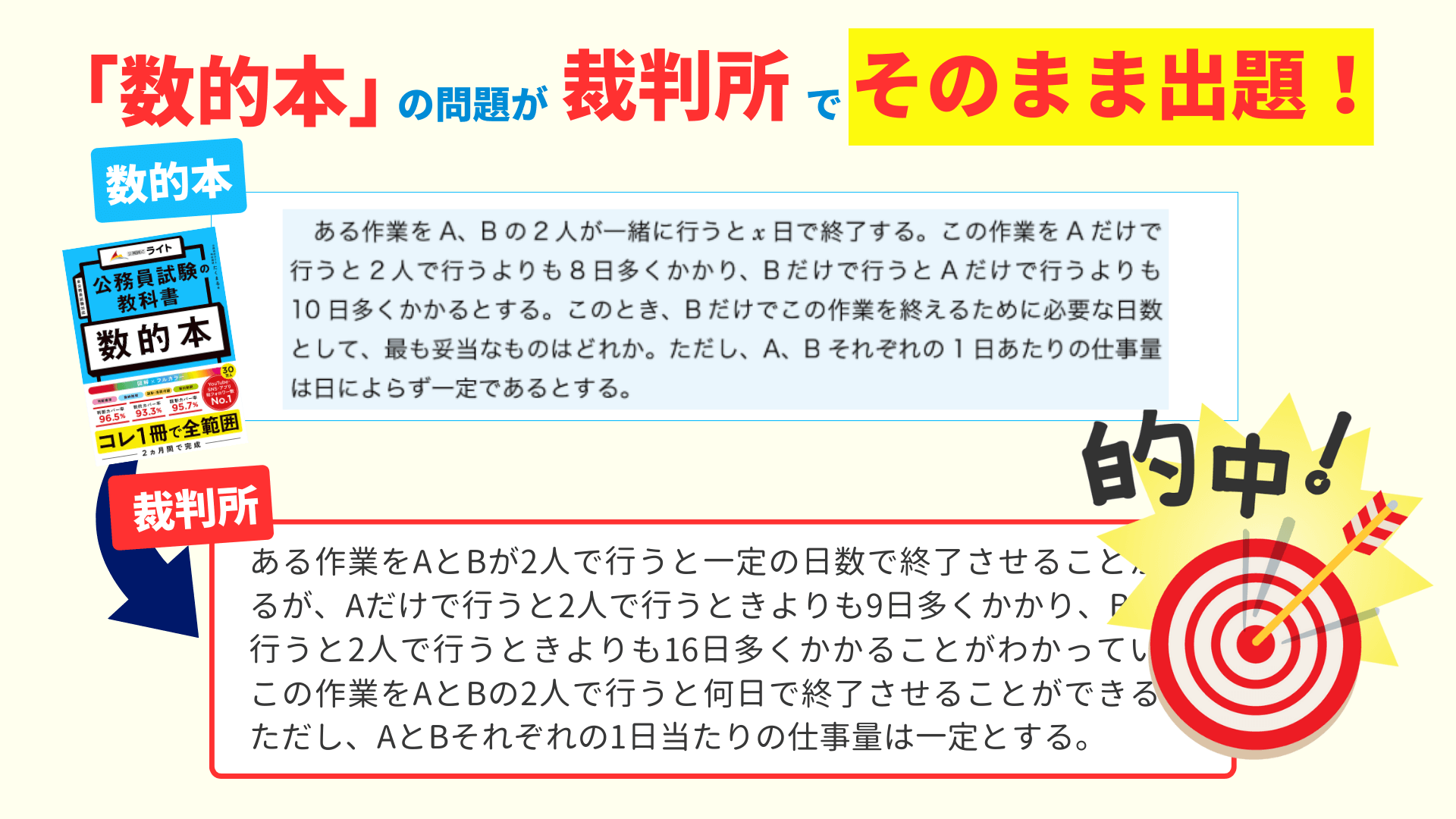 基本的には、公務員のライトの数的講座についている過去問演習問題だけで、合格は狙えるものになります。この問題もすべて解いてしまったということであれば、他の参考書等も活用してみて下さい。なお、公務員のライトでは、1ヶ月に1回、無料のライト模試を実施していますので、そちらもご活用ください。