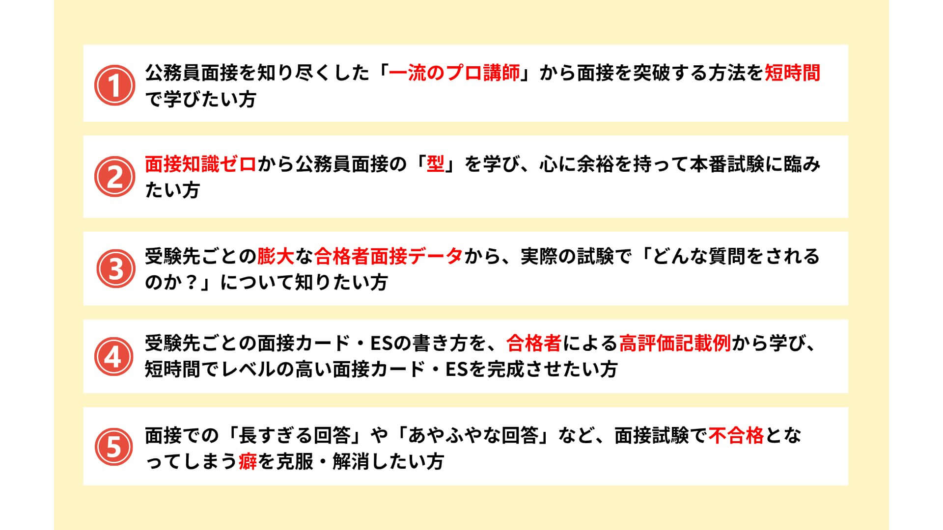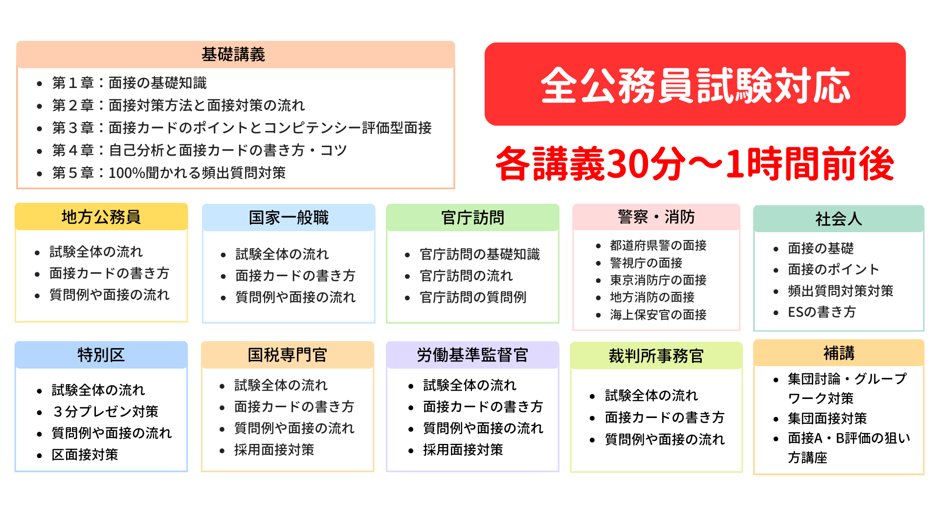 面接フルパックでは、①公務員面接の総論と②試験別ポイント解説がセットになっております。①の総論で面接の基礎部分を学び、②の各論で試験ごとの傾向を学んでいただきます。