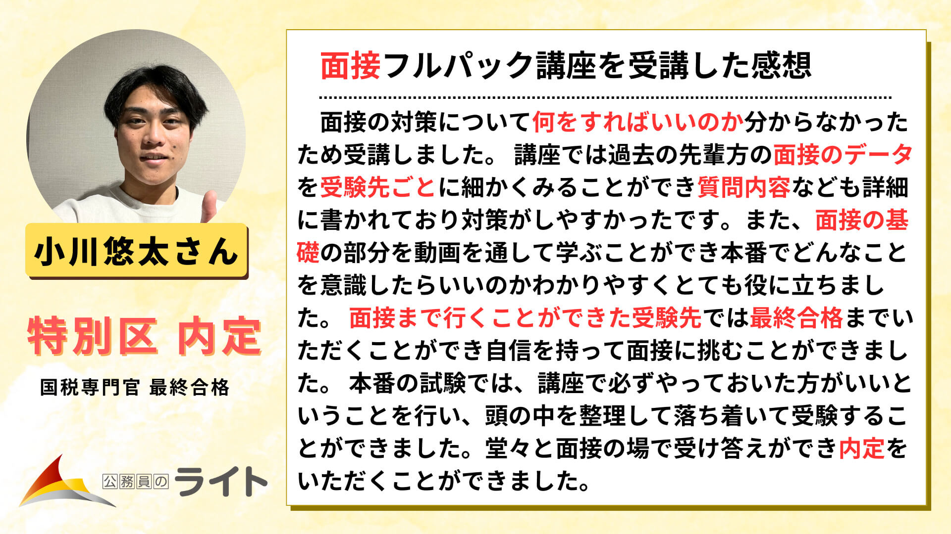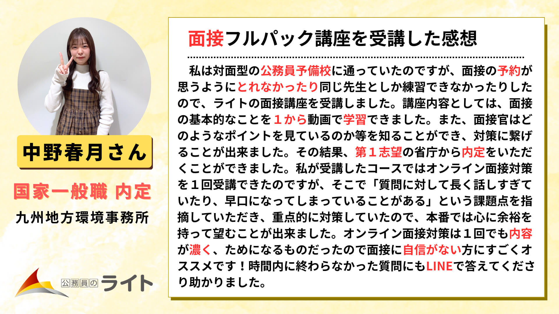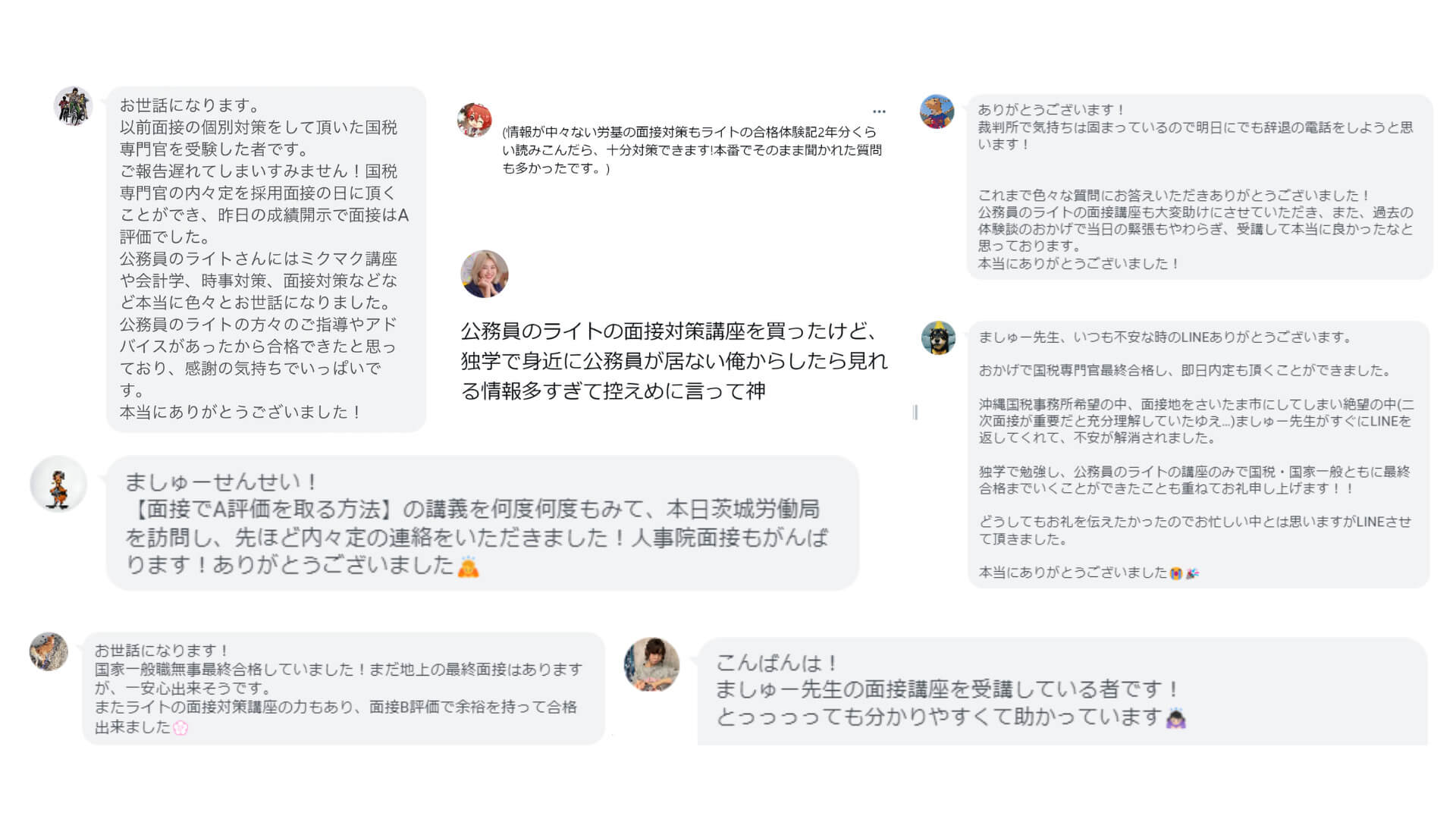 予備校や学内講座で対策している方からは「面接の予約が満枠で取れない」や「同じ先生としか練習できない」「公務員試験について知識や経験が乏しかった」「講師が高圧的や淡泊な対応だった」から「ライトの面接講座」を受講したと多くの声をいただいております。