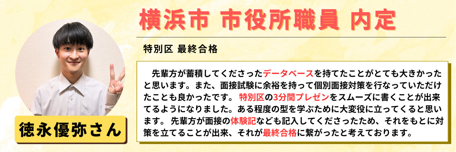 国家公務員や地方公務員に合格した方から「官庁訪問で面接官に印象が良かったと褒められた」や「エントリーシートのクオリティを面接官に褒められた」「第一志望の試験に合格できた」などたくさんの感想をいただいておりますのでチェックしてみてください!