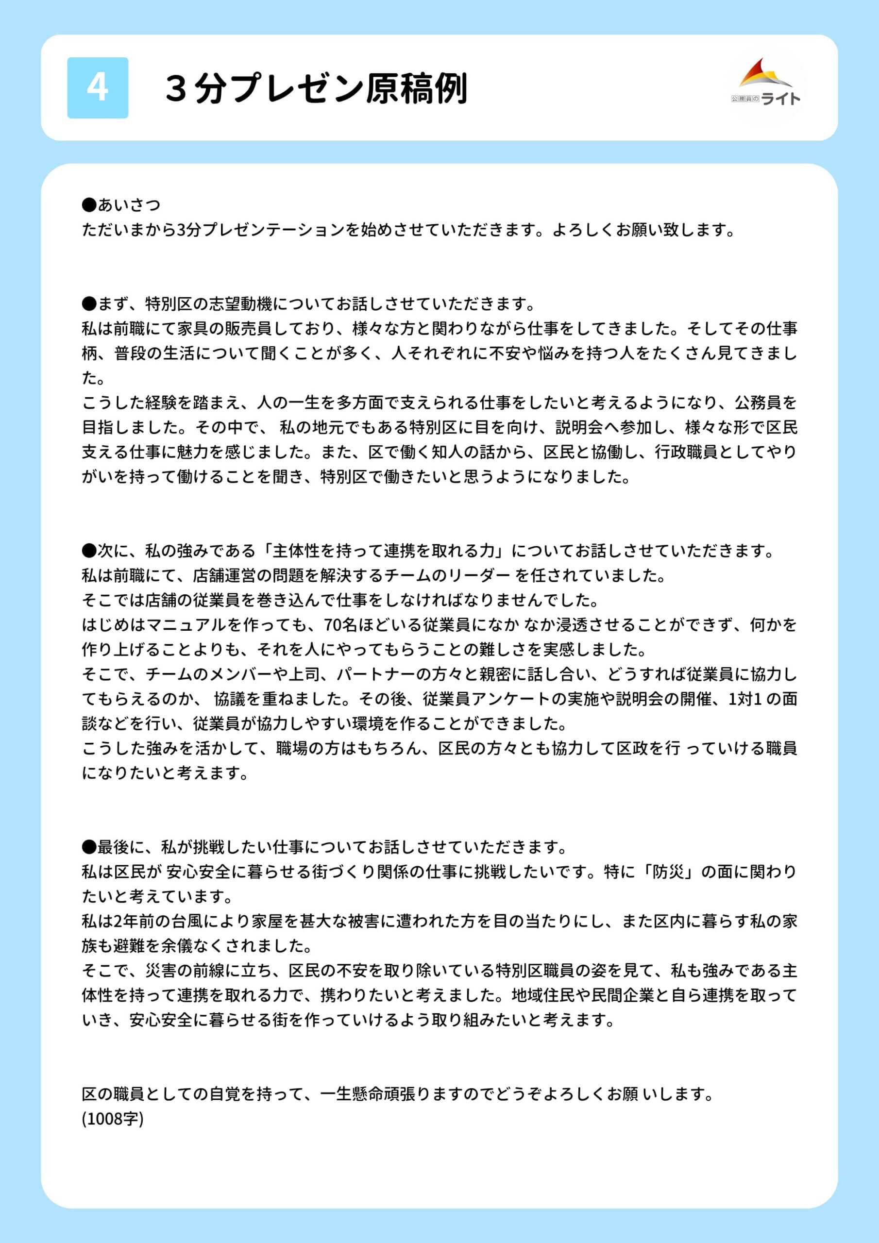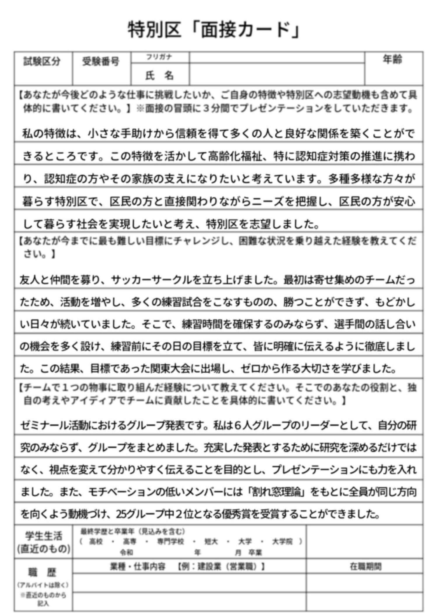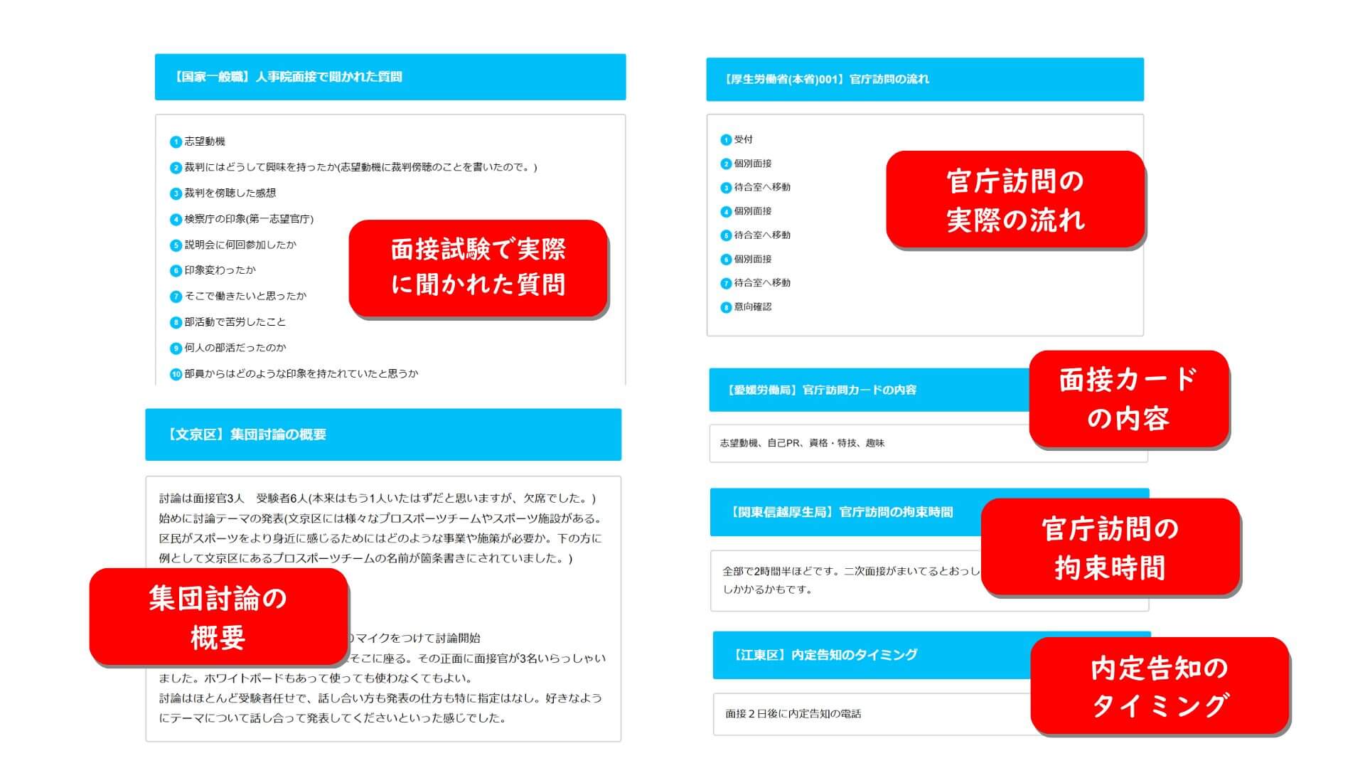 国家一般職の人事院面接・官庁訪問・国税専門官の人事院面接・国税局・特別区・区面接・都道府県庁・地方上級など、高順位合格者が完全再現した「面接カード」700件以上あります。そのため短時間でクオリティの高い面接カードが作成できます。
