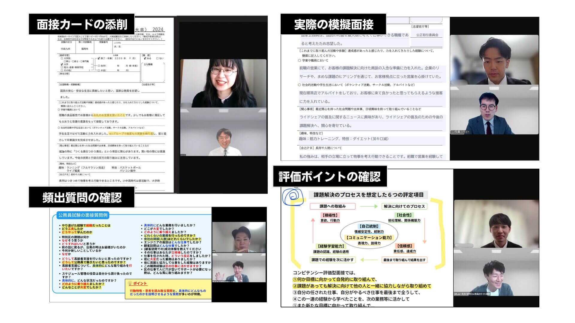 zoomによる個別面接では「講師と自己分析」や「講師による面接カード添削」「本番面接を再現した模擬面接」を行い志望先合格に向けた面接対策ができます。