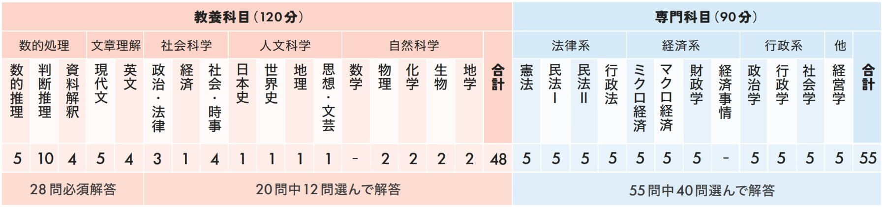 特別区の教養科目は試験時間が120分で、必須解答が28問と20問中12問選んで合計40問です。また専門試験は試験時間が90分で、55問中40問を選んで解答します。
